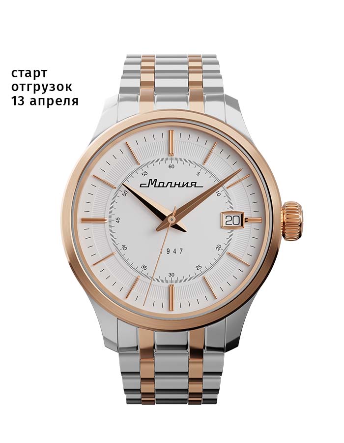 «Купить классические механические наручные часы российского производства на российском механизме Молния Дебют TCB 2416 41 мм противоударные с автоподзаводом и календарем со стальным браслетом корпус с PVD покрытием «золото» с бесплатной доставкой и гарантией 2 года в официальном интернет-магазине завода Molnija.Shop.»